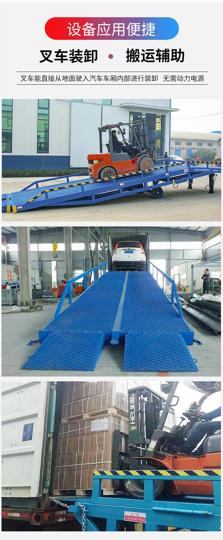 產(chǎn)品優(yōu)勢:移動式液壓登車橋單人操作,移動靈活方便,提高工作效率,節(jié)省勞動力,代替固定月臺不可移動的弊病。