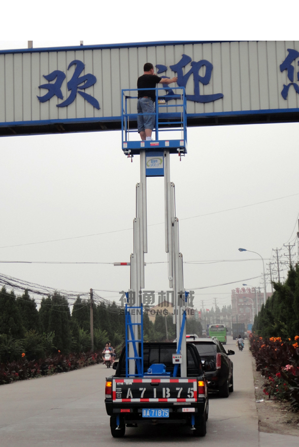 產(chǎn)品規(guī)格:車載鋁合金式升降平臺根據(jù)升降高度可分為:單柱6、8、10米,雙柱6、8、10、12米升降平臺,設(shè)備載重150公斤至200公斤??蛻艨筛鶕?jù)需求選用解放、東風(fēng)、輕騎、福田、電瓶車等任何車型,設(shè)備直接采用汽車或電瓶的直接動力升降。